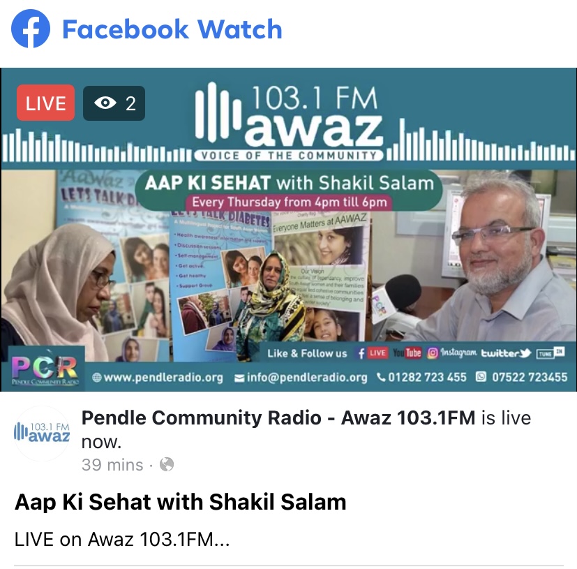 Join us and Dr Fiona Ford at Aawaz Community Radio with Shakil Salam.Aawaz Diabetes Project is the topic of discussion on the Aap KI Sehat Programme with Shakil Salam. Tune in to hear about our Diabetes project.
